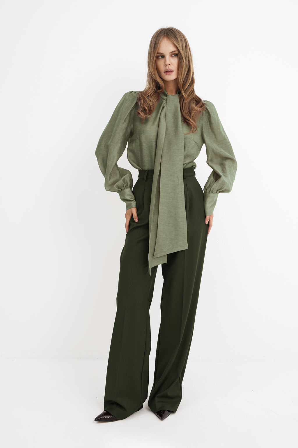100% вискоза Блуза из полупрозрачной вискозы с воротником-бантом. Детали: прямой силуэт, нагрудные вытачки, рукава длинные объемные со сборкой и высокими притачными манжетами с застежкой на навесные петли и декоративные пуговицы, блуза без застежки. Длина по спинке около 59,5 см в размерах 40-46 и около 61,5 см в размерах 48-52, длина рукава около 63 см 158-174 см