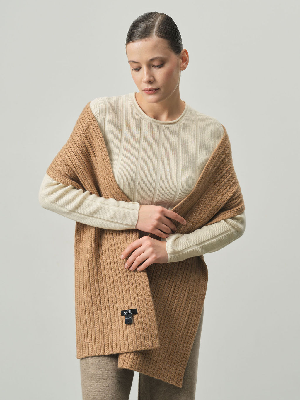 Рельефная вязка с вертикальным узором, аккуратные края, фирменная нашивка бренда.