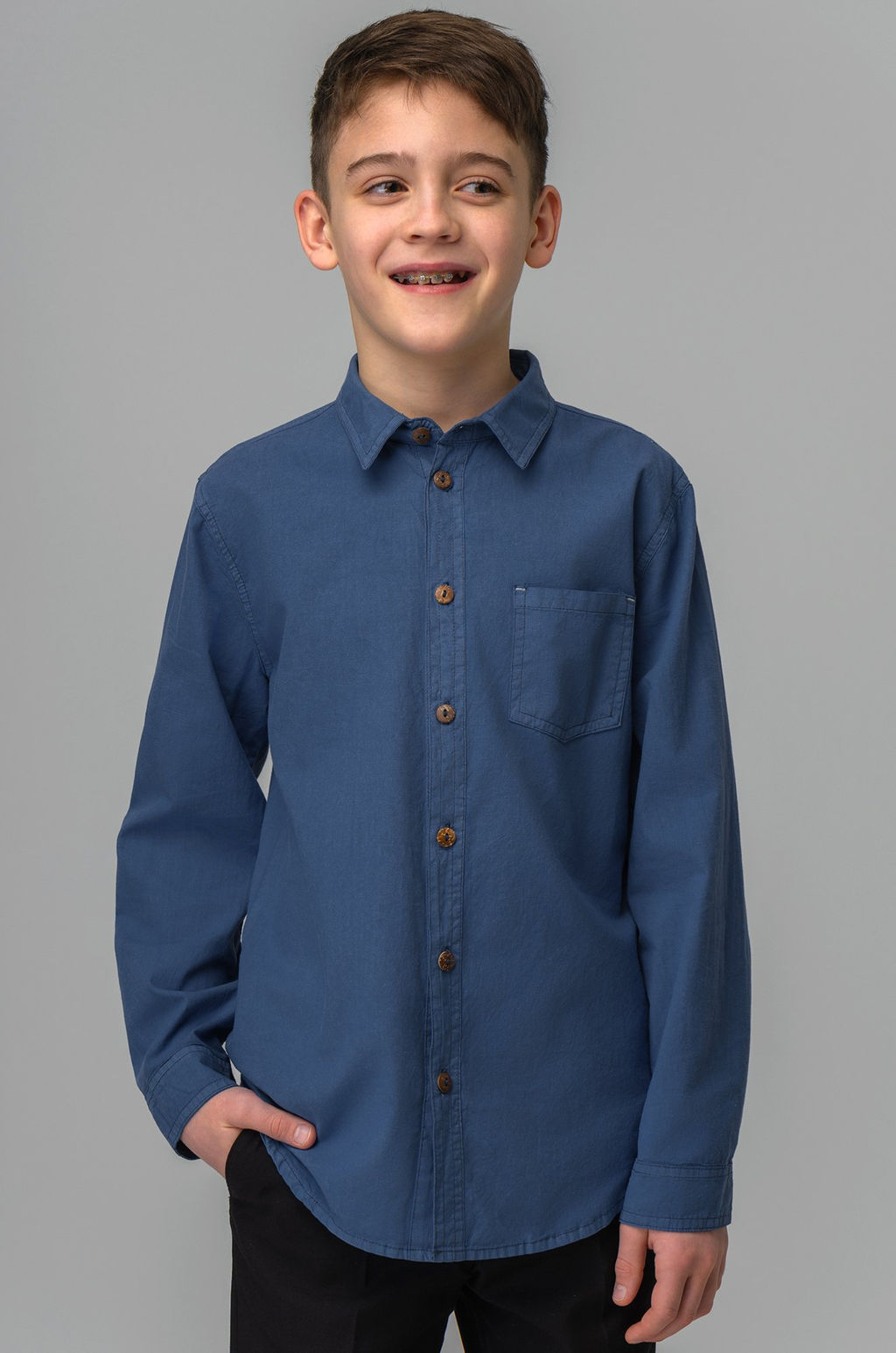 Детская рубашка выполнена из 100% хлопка. Свободный крой, манжеты на пуговицах и застежка на пуговицы спереди подарят комфорт. Нагрудный карман классная акцентная деталь. Кокосовые пуговицы имеют природную фактуру и стильно дополняют рубашку.