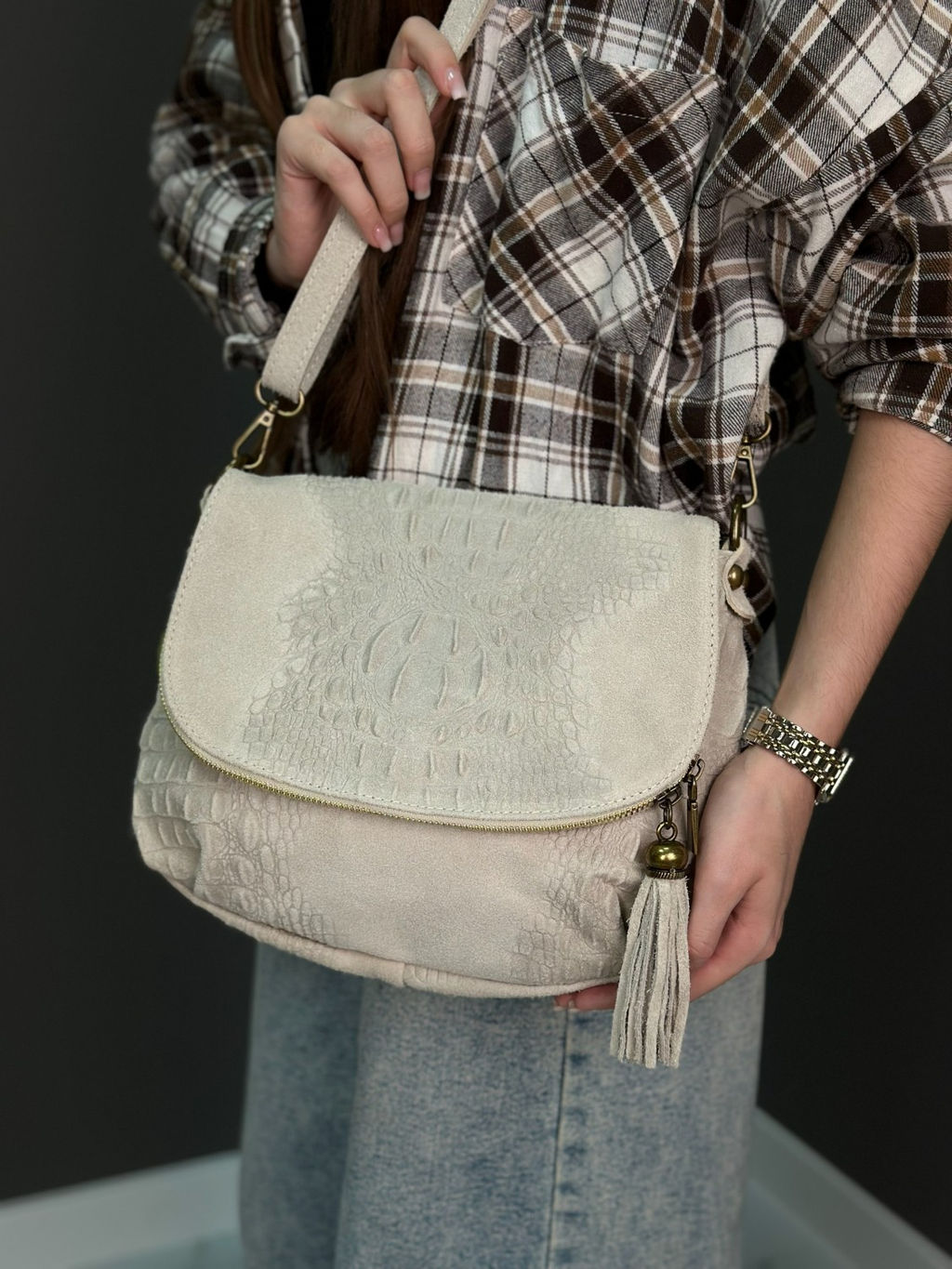 Страна: Италия Акции: Товары со скидкой Производитель: Pelletteria Luisa, Italy Размер: средняя Стиль ношения: на ремешке через плечо Форма: мягкая Выделка кожи: замшевая под крокодила Цвет кожи: Бежевый Оттенок: светло-бежевый Палитра цветов: TB-39 Caimano Размеры: длина: 30 см \tвысота: 23 см \tширина: 6 см Описание: Красивая и удобная женская сумка из натуральной кожи, производство Италия. Базовая коллекция, ХИТ Sefaro. Шикарная выделка кожи, замшевая с тиснением под крокодила, мягкая форма и оригинальная крупная кисть на молнии придают сумочке вид раритетной и антикварной вещи. Функциональность этой модели на высоте: довольно объемистое при компактных размерах основное отделение уместит все самое необходимое, регулируемый плечевой ремень позволит подобрать комфортную длину. Сама сумочка в целом яркая, эффектная, выполненная в самых разных фактурах кожи и цветовых решениях, как нельзя лучше подойдет энергичной красавице, стремящейся каждый день быть в трех-четырех местах одновременно. Модель сочетается с вещами в стиле Casual, будет органично смотреться в классическом, деловом, винтажном либо повседневном образах. Закрывается внахлест на кнопку и молнию. По периметру крышки двойная молния с декоративной кисточкой из натуральной кожи. Внутри одно большое отделение и два боковых кармана, один на молнии для мелких вещей, другой из натуральной кожи для телефона. С обратной стороны карман на молнии. Качественная итальянская фурнитуре в цвете матовой бронзы. Внутренняя отделка - качественная, водоотталкивающая, приятная на ощупь и долговечная в использовании, ткань. В комплекте имеется кожаный ремешок для ношения через плечо, длиной 120см, регулируется по длине - стильно, удобно и практично!