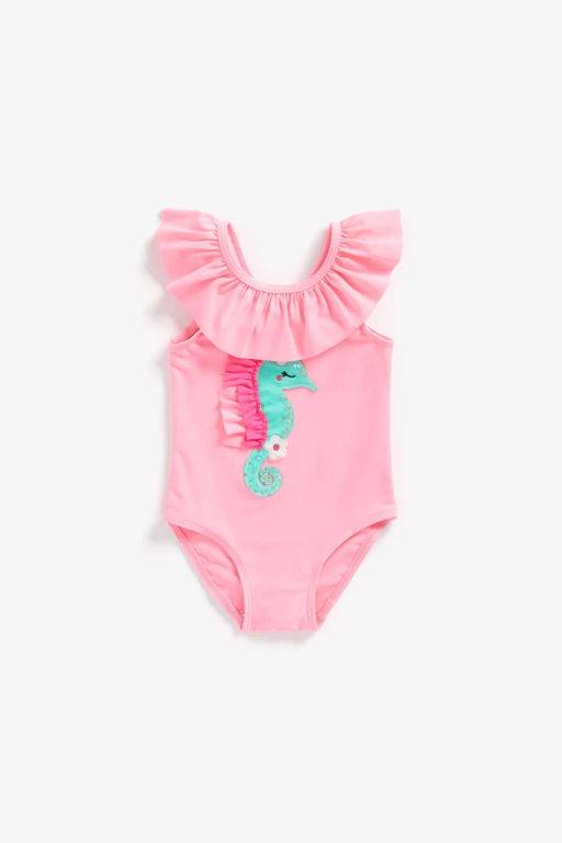 new 08/25 - Слитный купальник для девочки, украшенный аппликацией "Морской конек" и оборкой по горловине.