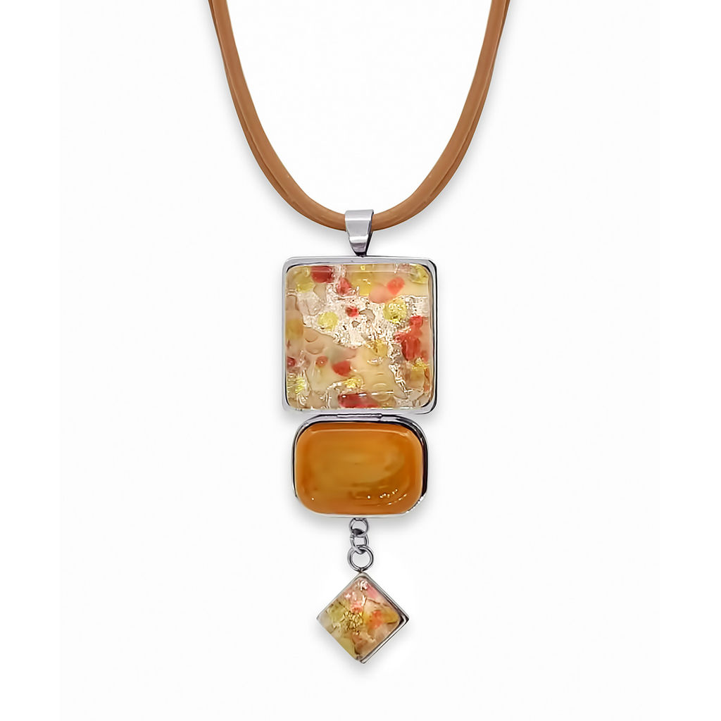 Колье изготовлено из натуральной кожи, муранского стекла и гипоаллергенной ювелирной стали, что очень важно для людей с чувствительной кожей. Металл не темнеет и не подвергается воздействиям окружающей среды, надолго обеспечивая красивый внешний вид изделия. Длина колье - 46 см + 5 см. удлиняющая цепочка. Длина кулона - 6 см. Размер стеклянных элементов - 2,2х2,2, 2х1,5 см. Ромб 1,3х1,3 см  Вес - 28  гр.­