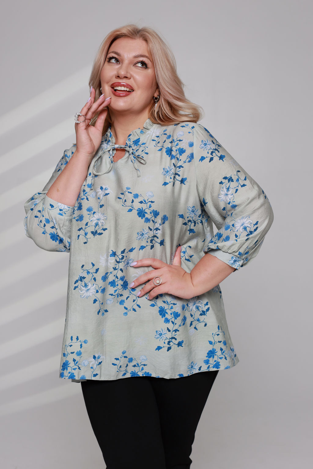 Оригинальная блузка из мягкого струящегося материала. Рукава длиной 3/4 присобраны по низу узкой манжетой. Женственный круглый вырез с разрезом на груди дополнен завязками.  Актуальный растительный принт добавляет модели динамичности и освежает образ. Мягкий, приятный телу материал подарит комфорт на весь день. Вы можете комбинировать блузку как с юбками различной длины, так и с брюками и джинсами. Эта модель станет незаменимым элементом вашего гардероба, подчеркивая индивидуальность и женственность.­