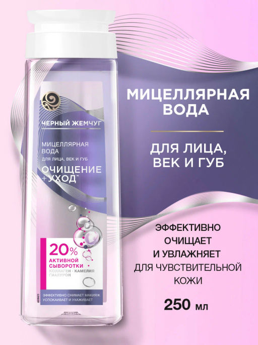 Мицеллярная вода для лица, век и губ Черный Жемчуг Очищение и Уход полностью удаляет макияж, не оставляя неприятной пленки на коже. Средство соответствует новому* стандарту очищения, смягчает и успокаивает кожу во время нанесения и дарит ощущение комфорта.