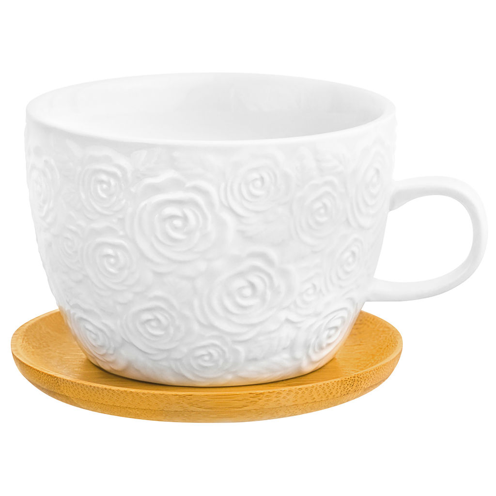 Чашка для капучино и кофе латте "Розы" на деревянной подставке, чашка 14,5*11,5*8 см 500 мл, подставка 12,8*12,8*1 см, размер чашки с подставкой 15*12,8*8,5 см