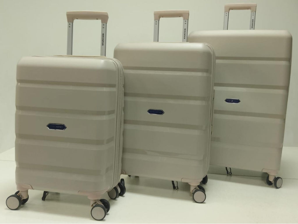 Универсальный комплект  MIRONPAN ,модель  выполнена из полипропилена современного материала, для которого характерны высокая ударопрочность, стойкость к перепадам температур, отличная износостойкость. Внутри находятся два отделения: одно - с  ремнями-фиксаторами; другое - с тканевой перегородкой на молнии, карманом-сеткой на молнии и карманом на молнии для мелочей. Выдвижная ручка фиксируется в 3-х положениях. Сверху предусмотрена дополнительная ручка для удобства переноски. 4 двойных колеса вращаются на 360, позволяя чемодану двигаться легко и плавно.