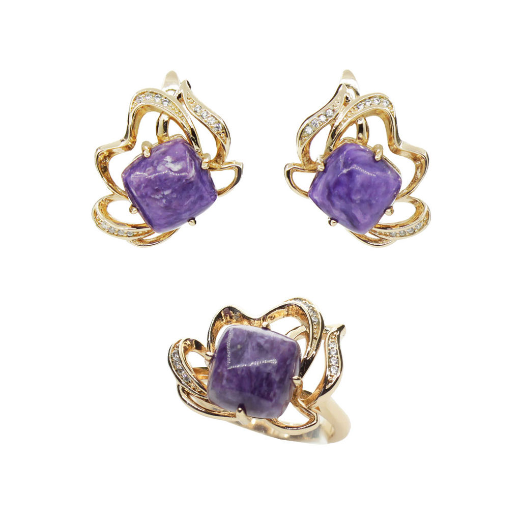 Комплект с загадочным и манящим чароитом и качественным покрытием. Размер камня в серьге: 10x10мм, размер серьги с застежкой: 21мм. Размер камня в кольце: 10x10мм.