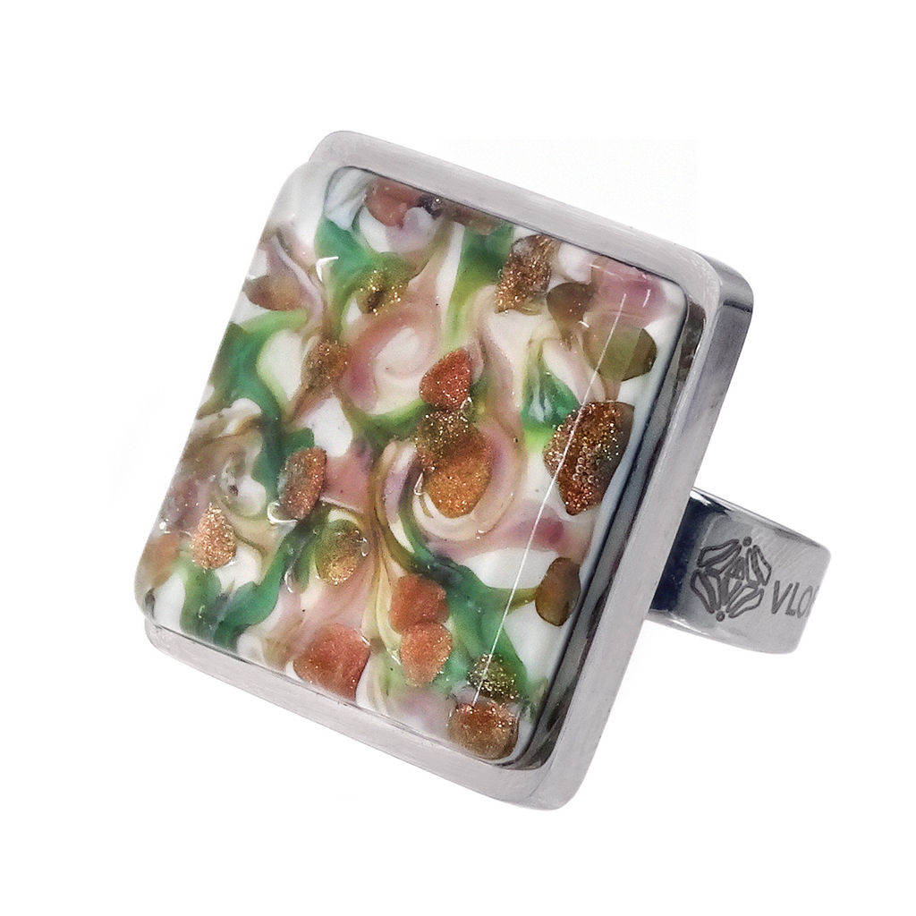 Кольцо изготовлено из муранского стекла и гипоаллергенной ювелирной стали, что очень важно для людей с чувствительной кожей. Металл не темнеет и не подвергается воздействиям окружающей среды, надолго обеспечивая красивый внешний вид изделия. Размер стеклянного элемента - 2,2x2,2 см. Кольцо безразмерное, регулируется с 16 до 19 размера. Вес - 15 гр.