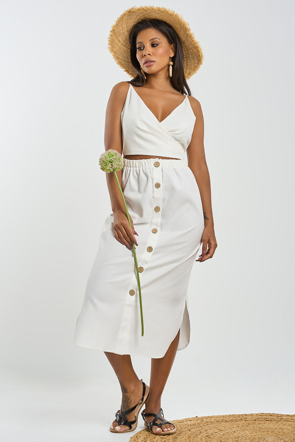 Особенности: Платье прилегающего силуэта из плательной ткани. Детали: тонкие бретели с регуляторами, отрезное по линии талии со сборкой на резину, лиф переда с запахом переходящим в завязку на спинке, карманы в боковых швах, фигурная линия низа с разрезами в боковых швах, по переду юбки планка с застежкой на петли-пуговицы.