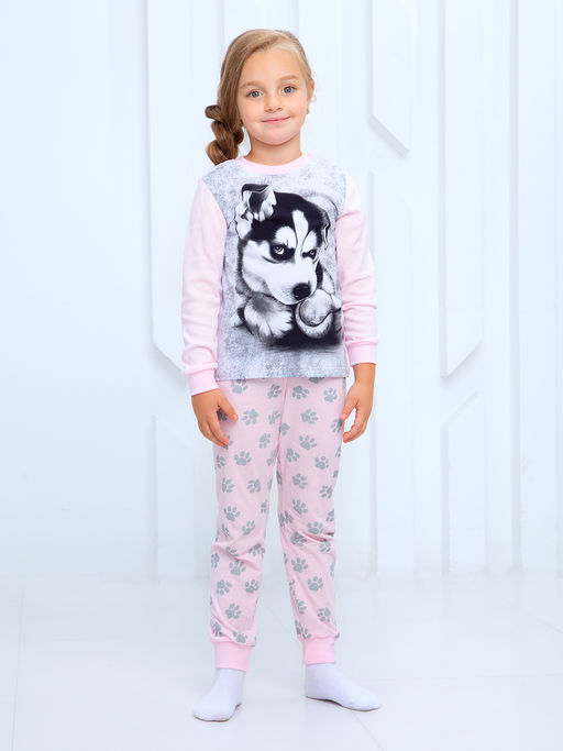 Изделие изготовлено из высококачественного трикотажного полотна.Украшением пижамы служит дизайнерский рисунок.Хаски-это удивительная порода,о ней мечтают дети со всего мира и мечта многих осуществится.Пижама,с этим добродушным и милым щенком,понравится вашим детям.­