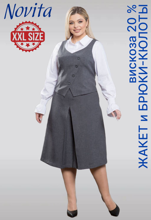 Элегантный 2-х предметный костюм выполнен из костюмной ткани. Верх костюма укороченный приталенный жилет. Перед жилета с рельефными швами, фигурным низом и ассиметричной застежкой на петли и пуговицы. Спинка со средним швом, рельефными швами и хлястиком, позволяющем регулировать плотность прилегания. Жилет со свободной заниженной проймой. Перед жилета на подкладе. Длина изделия по спинке в 48 р-ре 47 см. в 58 р-ре 53 см. Низ костюма брюки-кюлоты. Кюлоты со средней посадкой и расклёшенными штанинами, длиной немного ниже колена. По переду кюлоты выглядят как юбка со встречной складкой. В левом боковом шве застежка на потайной замок-молнию длиной 20 см. Верхний срез брюк с настрочными шлевками, обработан обтачками. Кюлоты без подклада. Длина по боковому шву в 48 р-ре 72 см. в 58 р-ре 75 см., длина по внутреннему (шаговому) шву в 48 р-ре 42 см. в 60 р-ре 42 см.