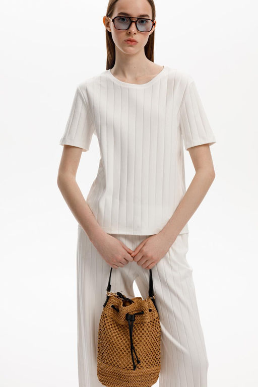 Базовая футболка из 100% гребенного хлопка. Необычное переплетение в виде широких полос придает изделию оригинальность, добавляя фактуры и динамики в образ. В сочетании с брюками из этой коллекции, вы создадите стильный образ для летних дней.. Состав: 100% хлопок