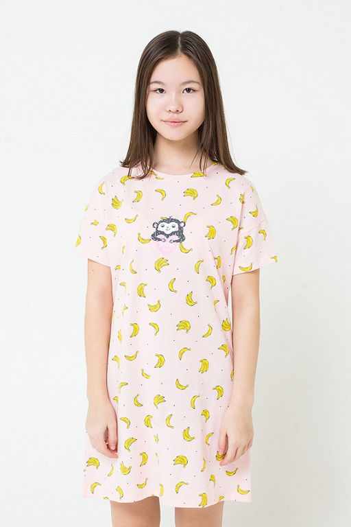 Сорочка для девочки из хлопкового трикотажа супрем с набивным рисунком. Рукава со спущенным плечом, длиной чуть ниже локтя. Удлиненная спинка, скругленная по низу. Спереди принт.­