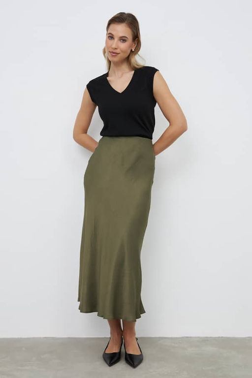 Юбка, слегка расширенная книзу из вискозной ткани с полуматовым сатиновым блеском. Крой юбки по косой, на линии талии скрытая резинка.