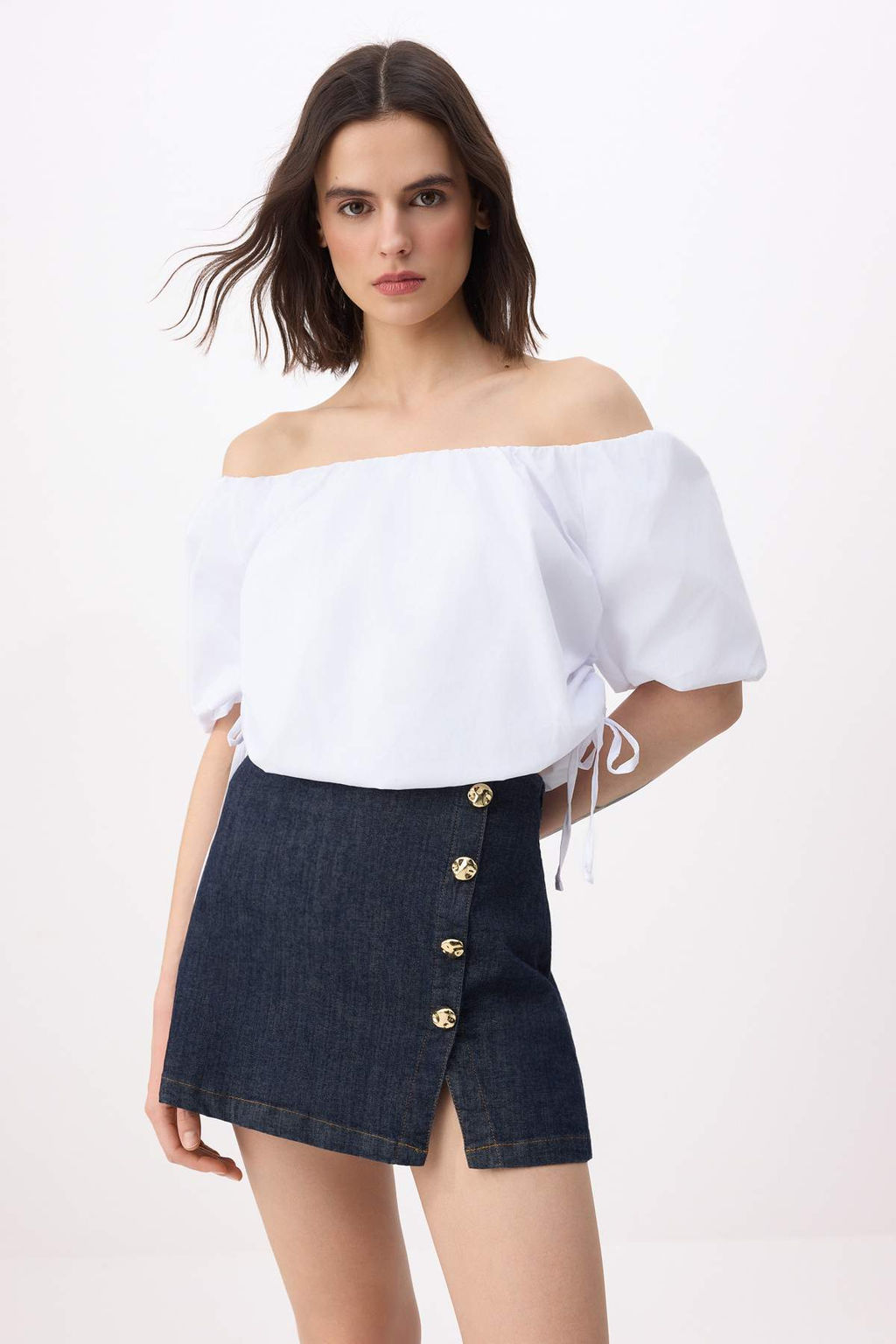 • Beyaz Baglama Detayl? Carmen Yaka Dokuma Balon Bluz TWOSS26BZ00419