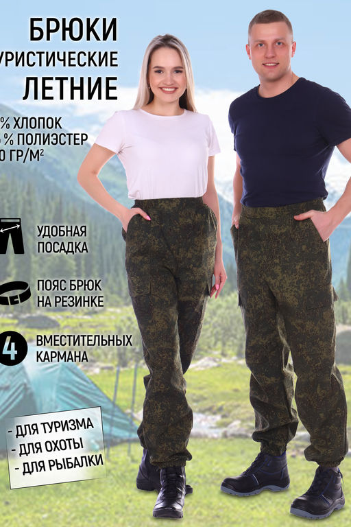 Брюки спортивные летние туристические. Бренд "СКЕЛА" предлагает штаны туристические, изготовленные из 35% натурального хлопка и 65% полиэстера. Брюки хорошо сидят, не сковывают движения, легкие и удобные. Универсальные и удобные с прорезными и накладными карманами. Пояс на эластичной резинке, что обеспечивает максимальный комфорт. Брюки представлены в камуфляжном цвете расцветки "Пиксель/цифра", которая неразличима глазом на фоне летней природы умеренной полосы. Прекрасно подойдет для охоты, рыбалки, туризма и прогулок, а также для хозяйственных работ, для строительных работ, для работы в сервисе и прочих работ. Модель унисекс. Представлен широкий размерный ряд, включающий большие размеры. По стандартам для спецодежды длина брюк измеряется от шва втачивания пояса (без учета его ширины) до низа брюк.