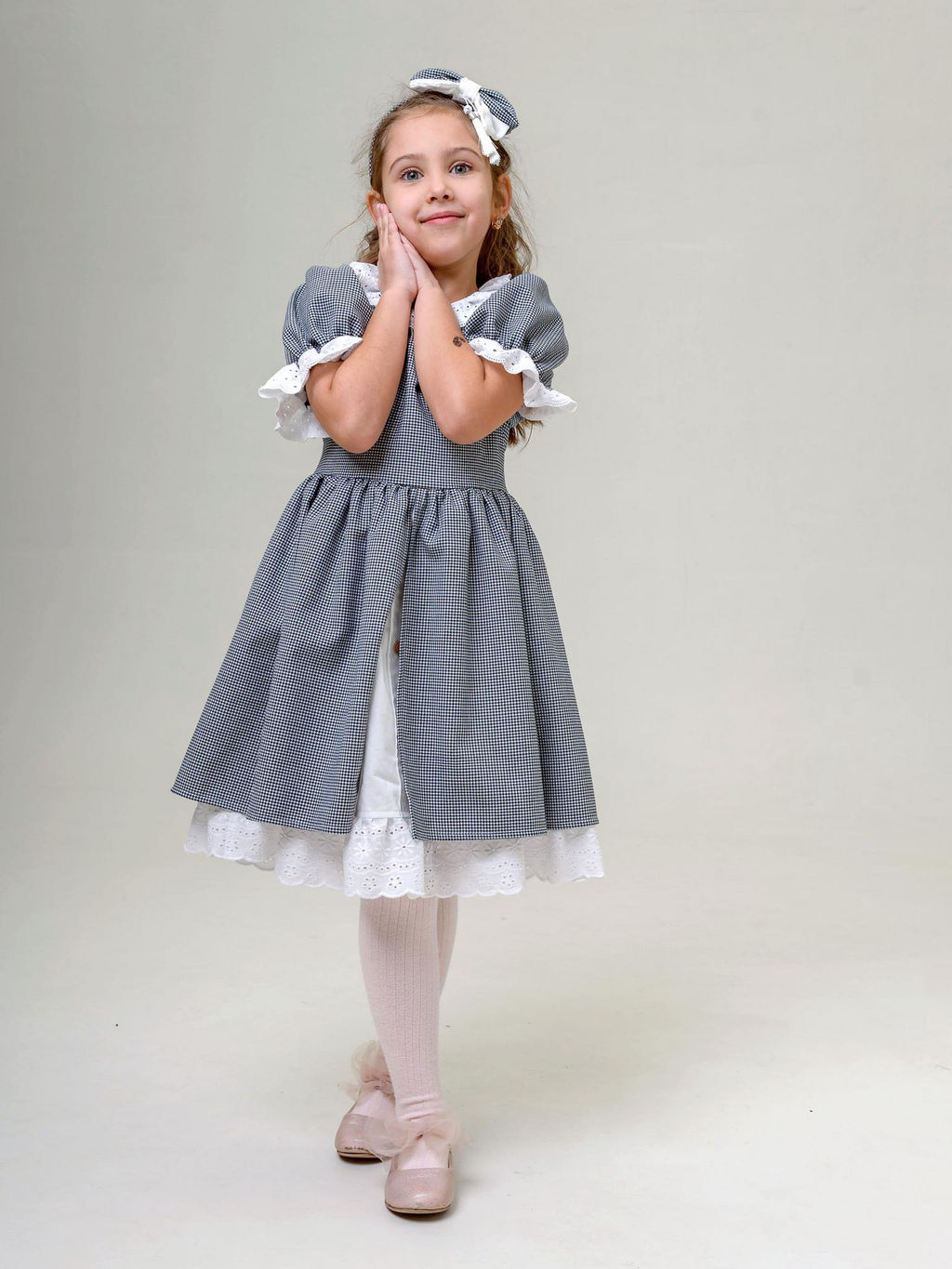 Милое изящное платье из хлопка и пэ идеально смотрится как на малышках, так и на девочках подросткового возраста.Платье практически не мнется. Пышный рукав фонарик с оборкой из хлопкового шитья Верхняя юбочка из основной ткани . Нижняя юбочка из плотного сатина с имитацией застежки на деревянные пуговки. По низу нижней юбки волан с хлопковым шитьем. Чуть завышенная линия талии . Сочетание нежного материала, натуральных  кружав и элегантного кроя. Пояс в боковых швах. Сзади застежка молния.