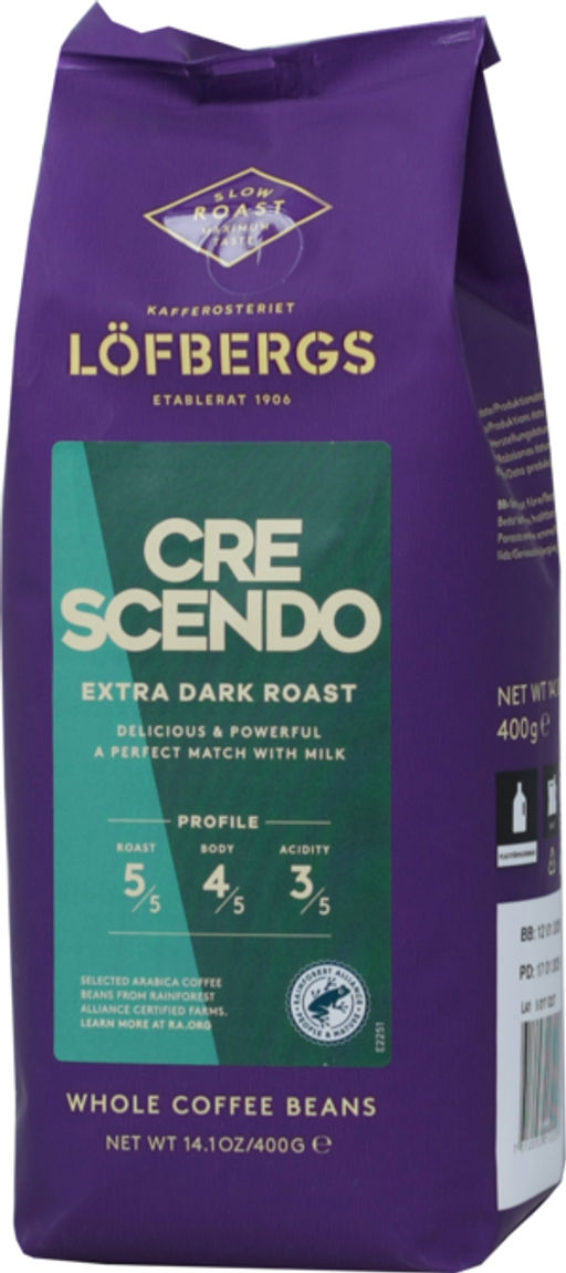 Натуральный зерновой кофе. Состав: 100% арабика. Обжарка: темная. Имеет экстра темную обжарку и отличается повышенной крепостью и насыщенным ароматом, во вкусе присутствует небольшая кислинка. Идеально сочетается с молоком и сливками. В составе Crescendo зерна 100% арабики из Бразилии, Колумбии, Центральной Америки и Восточной Африки.