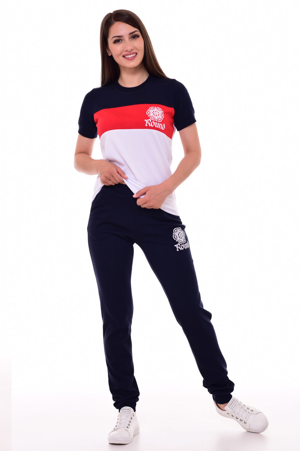 Костюм женский для активного отдыха, спорта и дома, состоящий из футболки и брюк. Футболка трехцветная , с печатным рисунком , прилегающего силуэта . Брюки на манжетах , зауженные к низу с тем же печтатным рисунком.