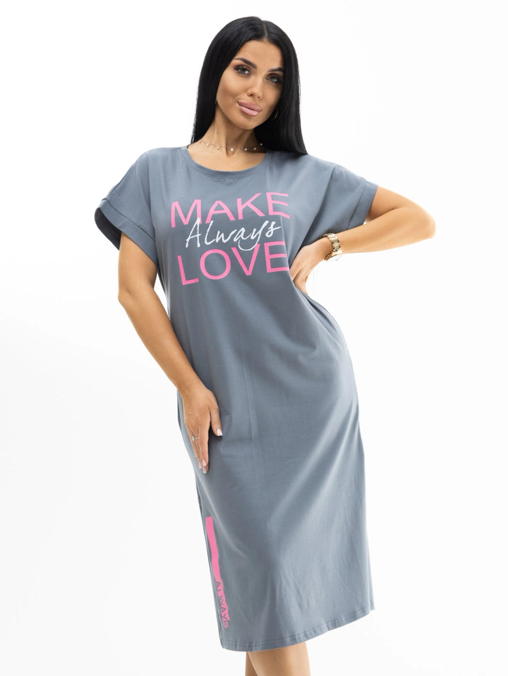 Женское прямое платье, длины миди, с О-образной горловиной, цельнокроеным рукавом с манжетой и разрезами по боковым швам. Спереди две печати одна сверху и одна по разрезу. В составе ткани 92% хлопка, за счет чего в жаркую погоду будет комфортно. Платье отлично будет смотреться с кросовками и джинсовкой.­