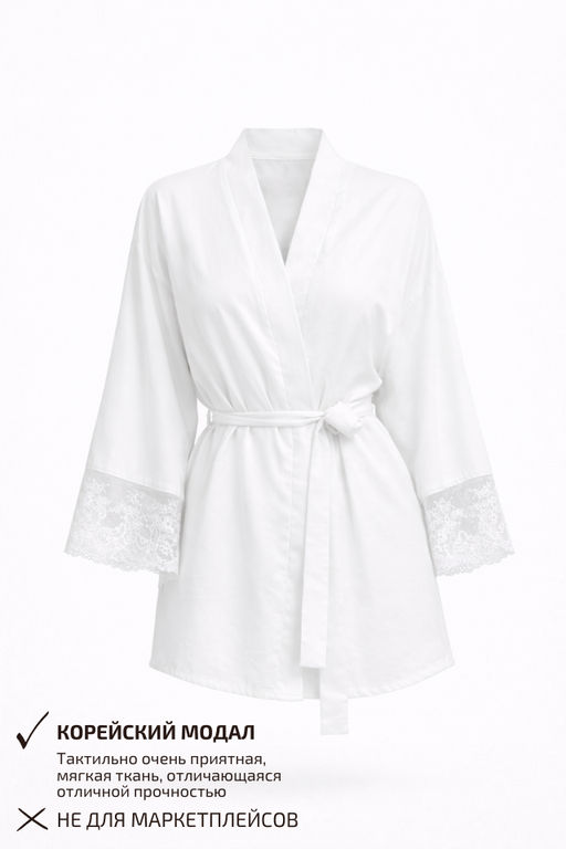 Укороченный халат из корейского модала притягивает взгляд своей роскошью. Рукава с изящным кружевом и пояс-лента подчёркивают грациозность силуэта, создавая эффектный и утончённый образ. Прочность и качество модала делают модель не только красивой, но и практичной для ежедневного ношения.