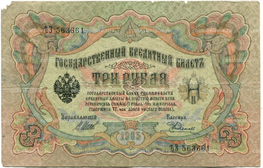 • Банкнота 3 рубля 1905 года Шипов / Родионов