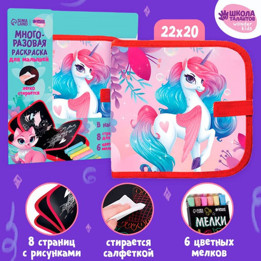 • Многоразовая раскраска книга для девочек «Сказочный единорог», 8 страниц
