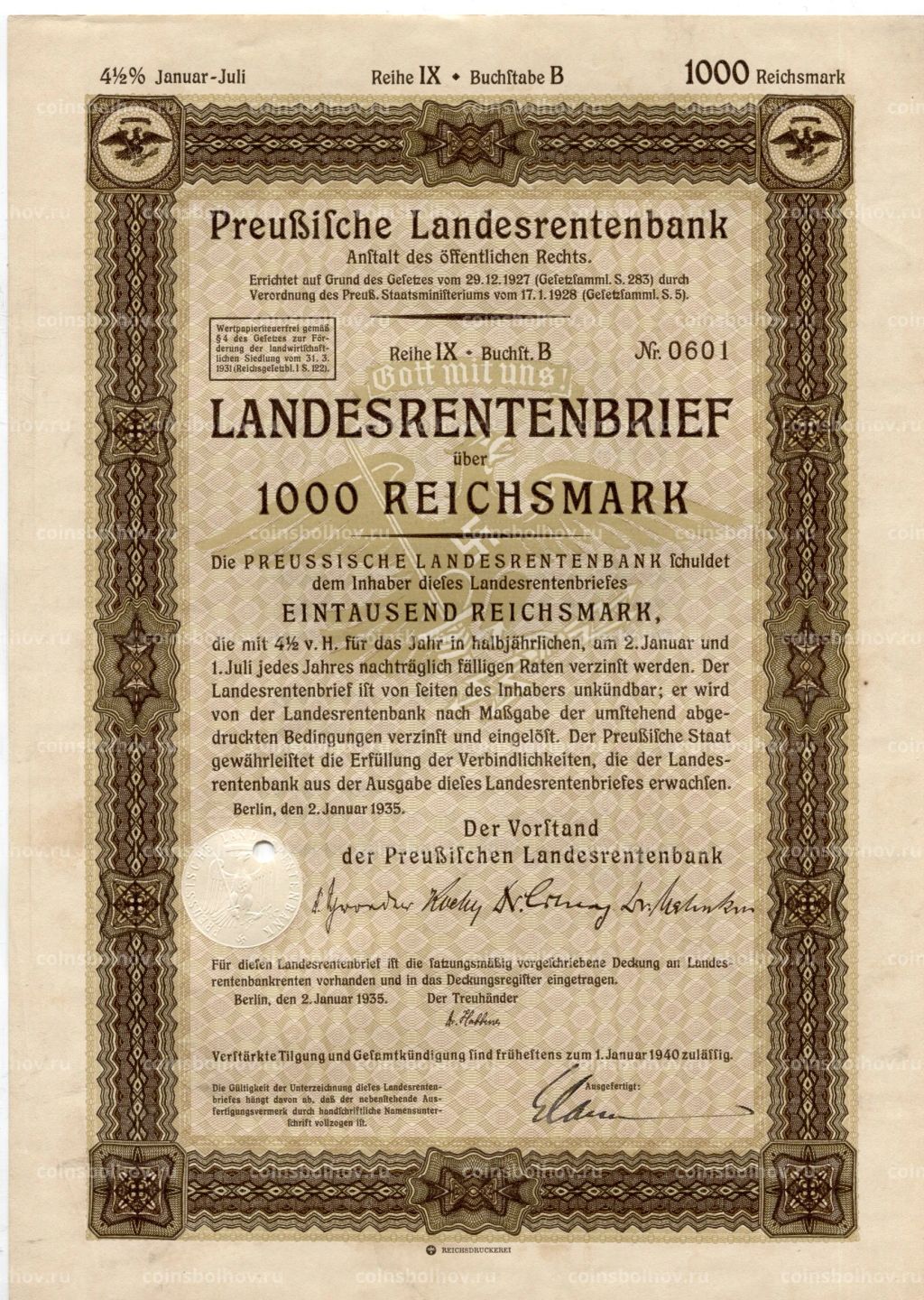 • Облигация 4,5% 1000 рейхсмарок 1935 года Германия