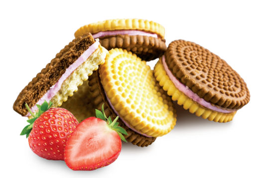 Между двухцветным хрустящим сахарным печеньем – шоколадным и ванильным - равномерно распределена кремовая начинка собственного производства со вкусом клубники. Удобный размер! Красивая форма! Яркий вкус!
