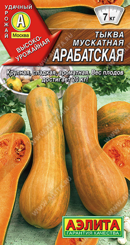 Один из самых сладких и крупноплодных сортов столового назначения. Урожай собирают на 115-125 день после всходов. Необычные плоды достигают длины 50-60 см, массы 6-7 кг. При высокой агротехнике до 20 кг. Семенное гнездо небольшое, сосредоточено в основании. Мякоть интенсивно-оранжевая, хрустящая, плотная и сочная, с высоким содержанием каротина и сахаров. Вкус великолепный, с сильно выраженным мускатным ароматом. Незаменимый сорт для приготовления диетических соков, десертов и сладких блюд.