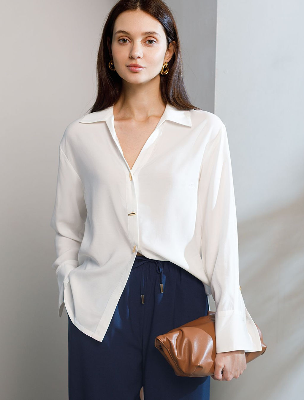Блузка натурального белого цвета сочетает в себе комфорт и элегантность благодаря материалу из вискозы с лиоцеллом. Аккуратный отложной воротник подчеркивает утонченность образа, а продолговатые металлические пуговицы золотистого цвета добавляют выразительный акцент и придают блузке благородный вид. Широкие манжеты на рукавах привлекают внимание и делают силуэт современным. Спущенная линия плеча формирует расслабленный, но стильный внешний вид, что идеально для тех, кто ценит индивидуальность и уверенность в деталях. Крой продуман так, чтобы подчеркивать достоинства фигуры и на больших размерах, создавая гармоничный силуэт без лишних усилий. Ткань из вискозы с добавлением лиоцелла обеспечивает приятные ощущения и отличную посадку, струится на теле и охлаждает в жаркую погоду. При пошиве использована технология чистый край по всей длине центральной планки и низу изделия. Это признак премиум качества чистый край вместо оверлока. Блузку можно носить с топом, не застегивая при этом распахнутая блузка будет выглядеть максимально эстетично.Рубашка легко впишется как в деловой гардероб, так и в повседневный стиль, позволяя выглядеть безупречно независимо от ситуации. -- Характеристики -- Состав: 55%Вис 45%Лиоцелл (Вис) Плотность: 115 Г/м2