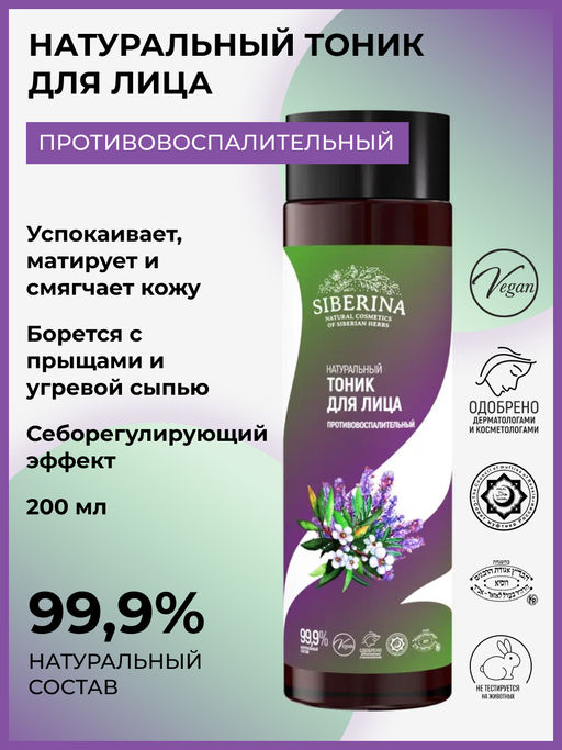 Натуральный тоник для лица рекомендуется для жирной и проблемной кожи, склонной к высыпаниям и угревой сыпи. Благодаря натуральным компонентам в составе он снимает раздражение и покраснение кожи, способствует быстрому заживлению и помогает предупредить появление новых воспалений.