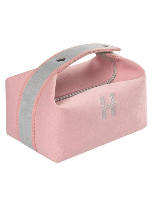 Косметичка выполнена из прочной ткани в нежном розовом цвете. Акуратная вышивка в тон добавляет изысканности, а контрастная бордовая ручка делает аксессуар удобным для переноски и визуально выделяет модель.
