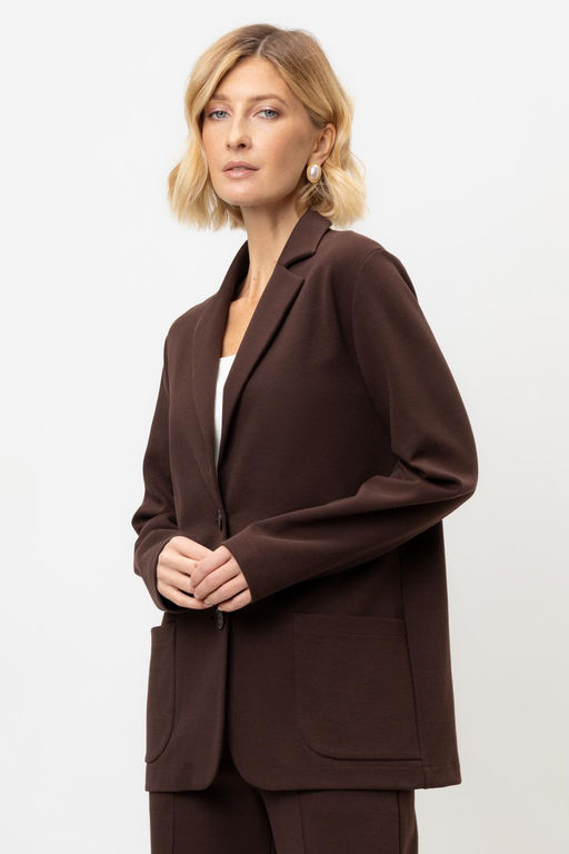 Женский жакет с карманами прямого кроя с застежкой на пуговицы и двумя накладными карманами из плотного гладкого трикотажа интерлок.