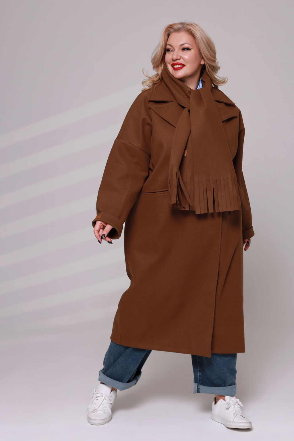 Лаконичное пальто оверсайз из мягкого материала с шарфом это универсальная вещь для холодной погоды. Глубокий V-образный вырез оформлен отложным воротником с лацканами. Приспущенные рукава полной длины по низу оформлены отворотами. Прорезные карманы по бокам добавляют модели практичности. Застегивается пальто на оригинальные пуговицы. Модель отлично сочетается с любым предметом гардероба. Вы можете сочетать его с платьями, юбками различной длины, брюками и джинсами. Пальто универсально, поэтому и одежда к нему подходит абсолютно любая. Будет стильно смотреться как с обувью на высоких каблуках, которая придает вам женственности и элегантности, так и с повседневными удобными кроссовками.­