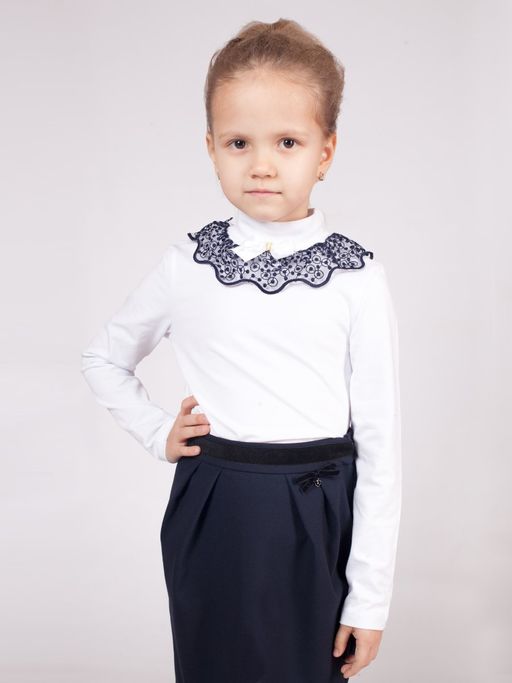 Водолазка для девочки из трикотажного полотна с длинным рукавом,прилегающего силуэта, средней длины. Горловина округлая с воротником стойкой. На переде кружево и ложная планка с декоративной пуговицей Состав:92% хлопок, 8% лайкра