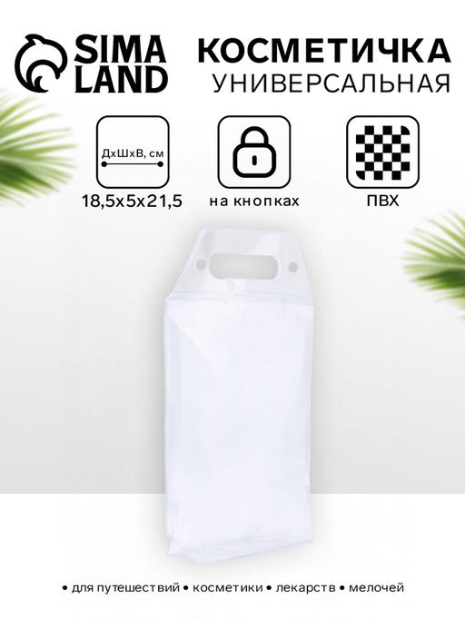 Для кого: Унисекс. Длина, см: 18.5. Ширина, см: 5. Высота, см: 21.5. Количество отделений: 1. Вид застёжки: Кнопка. Тематика: Однотонная. Рисунок: Нет. Особенности косметичек: Прозрачные. Бесплатная доставка: Да. Размеры товара: 5/21.5/18.5. Примечание: Оттенок данного товара может незначительно отличаться от фото/видеоизображения (в зависимости от настроек яркости вашего экрана).. Примечание: При отрицательной температуре материал становится хрупким. Поэтому перед использованием дайте товару согреться до комнатной температуры..
