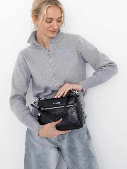 Модель кросс-боди, выполнена из натуральной кожи.  Дополнена серебристой фурнитурой. Данная модель закрывается на молнии. Каркас мягкий. Носится на плече за съемный ремень. Или в руке за за удлиненную съёмную ручку. На дне предусмотрены ножки.