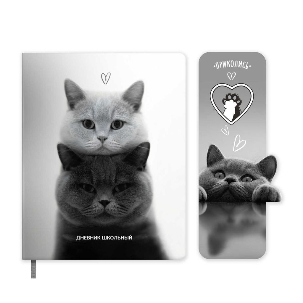 Дневник школьный в комплекте со значком-пином арт. 72556 / 15 ДВА КОТА (кожзам: А5+; твёрдый переплёт, материал обложки: искусственная кожа "Наппа"; декор: печать полноцветная; способ крепления блока: ниткошвейный; вн. блок: 48 л., белый офсет 80 г/м?, печать в одну краску, справочный материал: универсальная шпаргалка; закладка: одно ляссе; форзац: печать в одну краску; особенности: металлический значок-пин в комплекте; индивидуальная упаковка: ПЭТ-пакет)