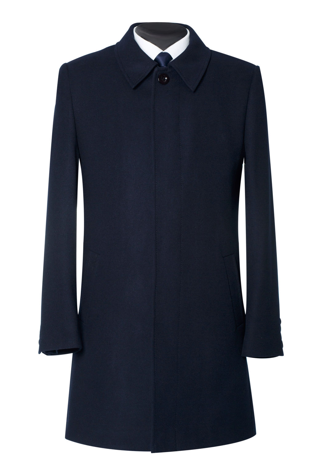 Пальто мужское, прямого силуэта, однобортное, с супатной застежкой на пять петель, воротник отложной.