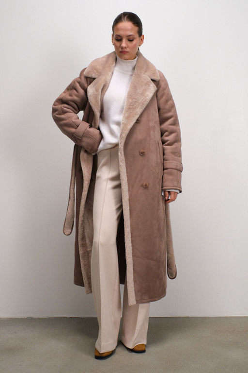 Элегантное двубортное пальто-дублёнка из мягкого эко-меха. Классический английский воротник и удобные карманы добавляют практичности, а рукав реглан обеспечивает идеальную посадку. Декоративный хлястик с пуговицей на рукаве придает изделию завершенный вид. В комплекте пояс.