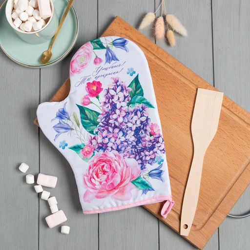 Этот кухонный набор практичный и тёплый подарок для хозяйки. Две вещи, которые всегда нужны на кухне, объединены в стильный комплект с весенним цветочным принтом. Они сделают приготовление пищи безопаснее и добавят уюта в интерьер.