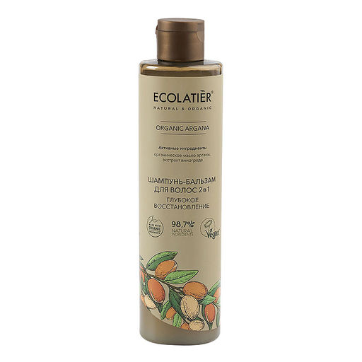 Шампунь-бальзам 2 в 1 ECOLATIER® Organic Argana бережно очищает волосы и кожу головы, поддерживает естественный защитный барьер, обеспечивает волосам нежный уход, мягкость и легкое расчесывание.