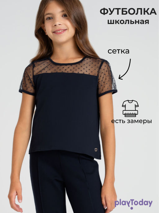 Школьная синяя футболка - прекрасная альтернатива рубашке в школу. Минималистичный дизайн и приталенный силуэт модели делает футболку базовым элементом для комфортного повседневного гардероба девочки подростка. Высокое содержание хлопка 95%. Благодаря наличию эластана в составе ткани футболка для школы проще в уходе и отлично держит форму. Футболка для школы с рукавами из сетки разнообразит повседневные образы школьницы.