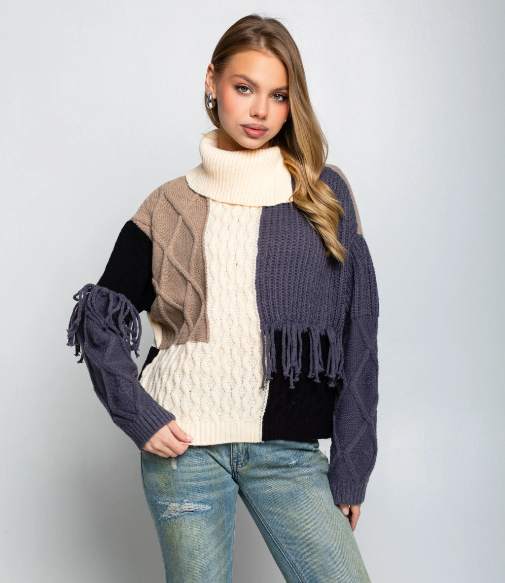 Свитер это одежда, которая подчеркивает привлекательность и элегантность каждой представительницы прекрасного пола. Плотный вязаный свитер свободного силуэта с высоким сложенным воротником, длинными рукавами с выраженной шириной в верхней части и зауженными манжетами, соединёнными с корпусом втачными плечевыми швами; перед и спинка выполнены из нескольких видов узоров жгутовые косы, ребристая резинка и более плотная гладкая вязка собранные в асимметричные блоки и соединённые декоративными швами; по линии груди и на рукавах присутствуют короткие бахромные кисточки, добавляющие фактурный акцент. Для пошива использована ткань 50% акрил, 50% хлопок, которая характеризуется отличным качеством. Даже после многократных стирок изделие не утратит первоначальной красоты. Вы сможете носить его с радостью. Обратите внимание на цвет. Он является насыщенным и полностью соответствует фотографии на сайте. Чтобы вы были уверены в размере, мы представили на странице таблицу. Воспользовавшись ею, вы сможете сами обмерить себя и удостовериться. Предложенная нами цена является приемлемой. Не откажите себе в удовольствии быть элегантной! Рост модели 168 см., 89-63-90. Вы можете заказать онлайн презентацию на интересующие Вас модели. Наши менеджеры свяжутся с Вами и проведут индивидуальную видеотрансляцию, помогут составить заказ и ответят на Ваши вопросы. -- Характеристики -- Цвет: кремовый Пол: Женский Страна производитель: Китай Сезон: Зима Материал: Хлопок, Акрил