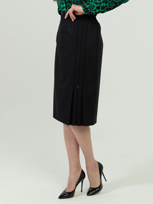 Женская юбка прямого силуэта, на подкладке, с притачным поясом по бокам на резинках, застежка расположена сзади по среднему шву на потайную тесьму молнию и закрепляется на пуговицу. Расположенные по ноге, застроченные складки, украшены декоративной пряжкой, закрепленной шлевкой.Рубашка арт.976-0894