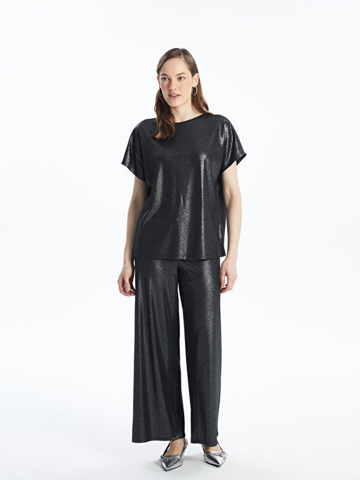 Beli Lastikli D?z Geni? Pa?a Kad?n Metalik Pantolon