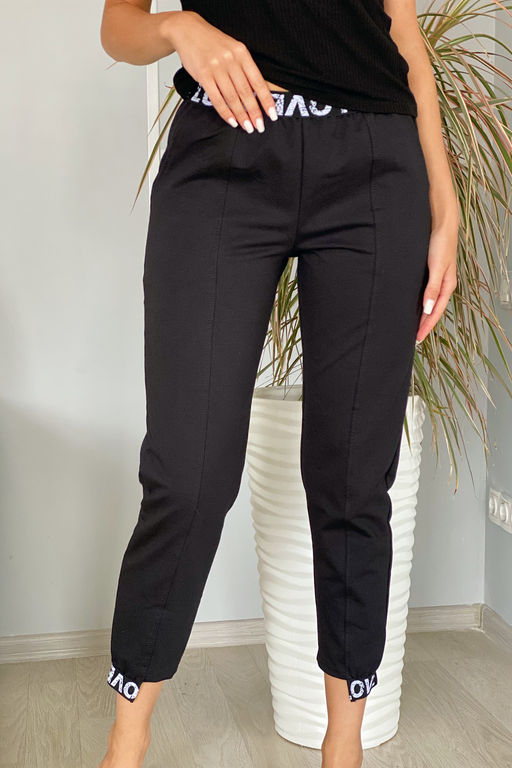 Брюки полуприлегающие, длиной 7/8, с карманами. Верх брюк обработан декоративной резинкой с надписью. Низ брюк фигурный.