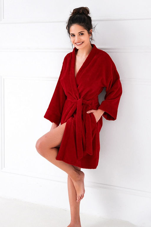 Яркий женский халат Rolling Red с длинными рукавами. Талию подчеркивает пояс. Халат можно использовать сразу после купания, отлично впитывает воду.­