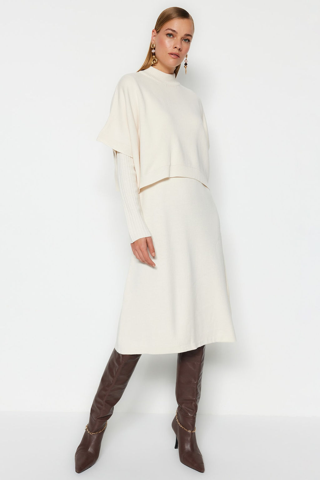 • Ekru Midi Triko Super Genis Kal?p Suveterli Elbise TWOAW24EL00012